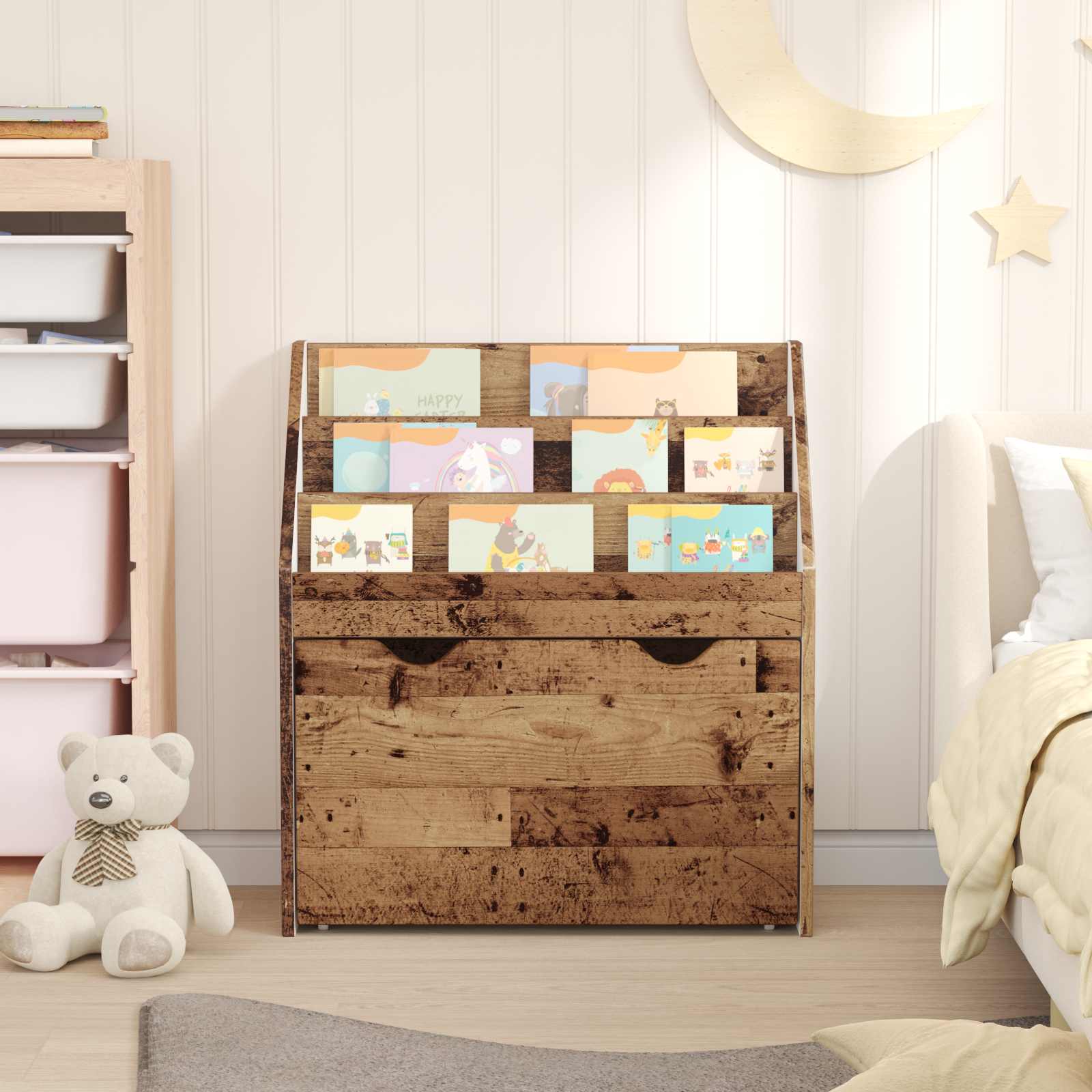 - Piisav salvestusruum: Riiul on jagatud sektsioonide ja sahtlitega, et raamatud ja väikesed mänguasjad oleks mugavalt paigutatud. Riiul on kompaktne ja maksimeerib salvestust, ilma et see võtaks liiga palju ruumi.