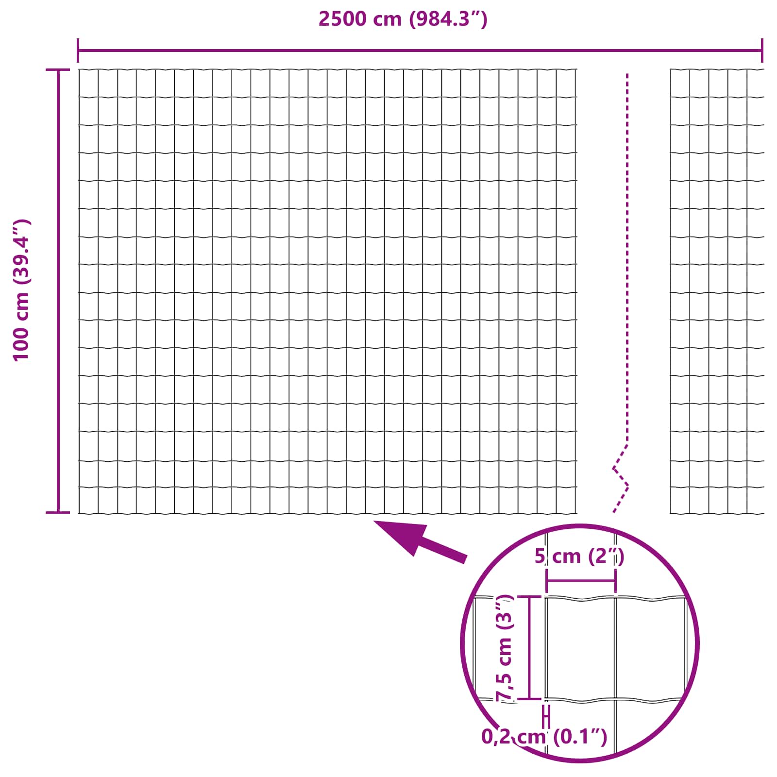 - Üldmõõtmed: 2500 x 3.2 x 100 cm (P x L x K)