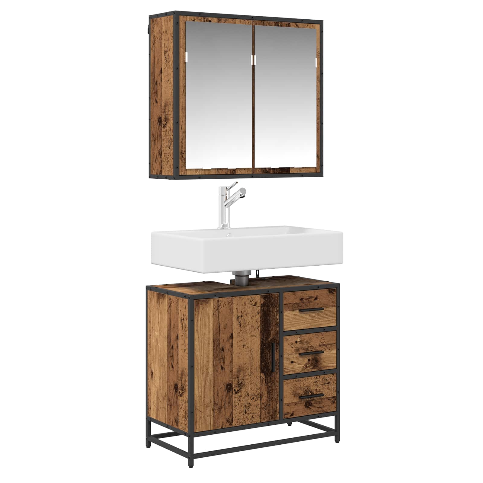 - Rohke ladustamine: See vannitoakomplekt on loodud ruumi silmas pidades, pakkudes palju ladustamisvõimalusi. Peeglikapp sisaldab peegeldavate uste taga riiuleid, mis sobivad nahahooldus- ja hügieenitoodete hoidmiseks. Kraanikausi kapp pakub lisaruumi basseini alla, et hoida rätikud ja hügieenitarbed kenasti korras.
