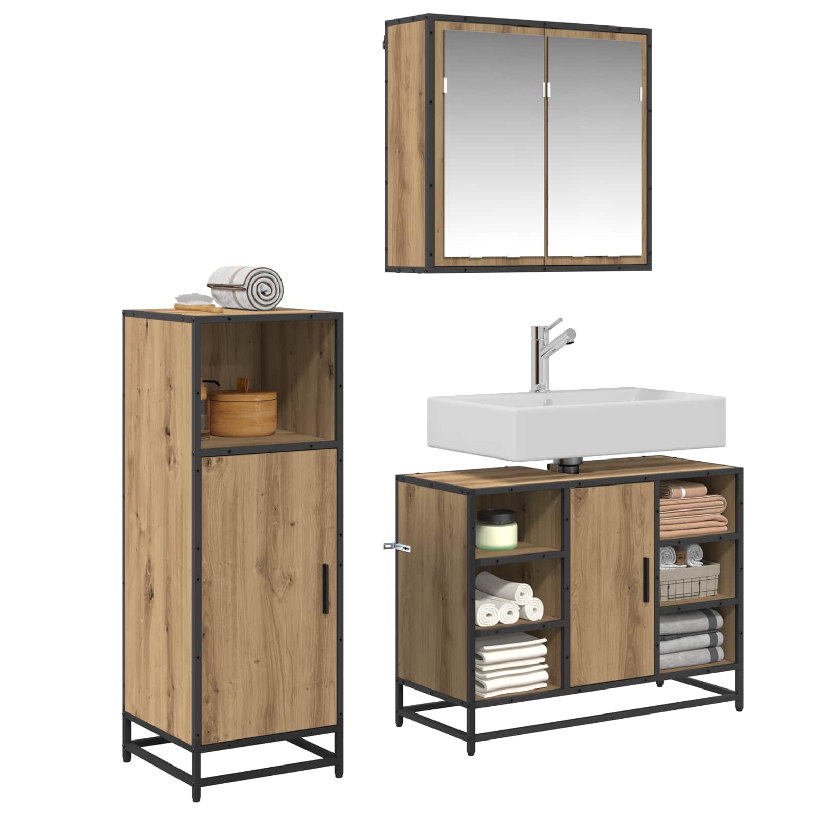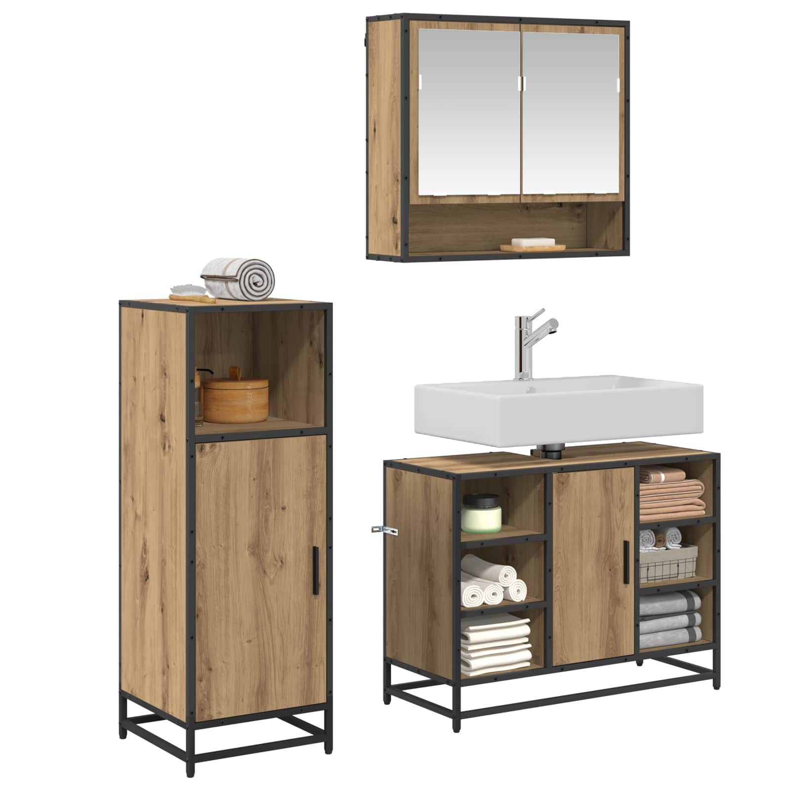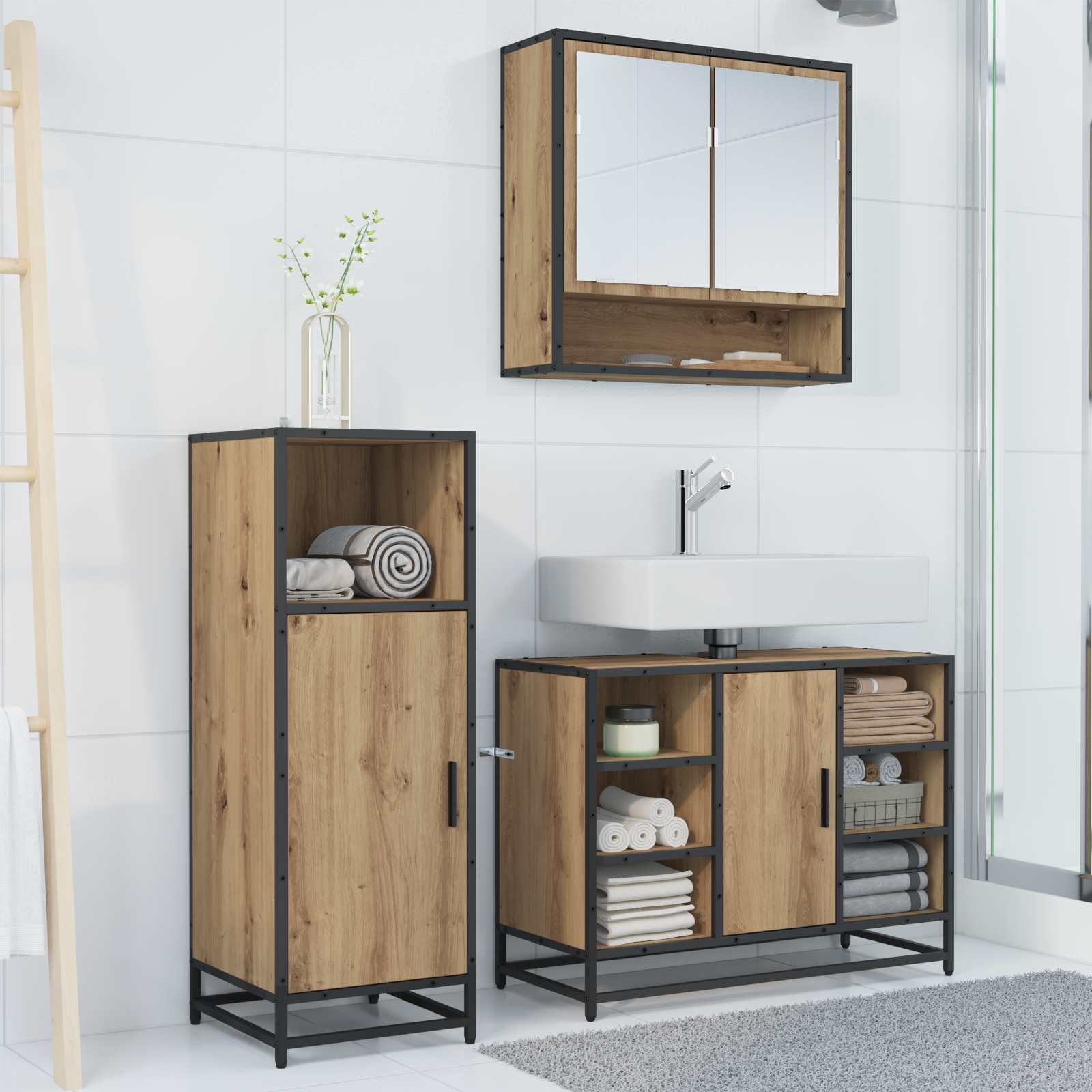 - Ruumi säästev lahendus Ideaalne väiksematesse ruumidesse, see komplekt aitab koduomanikelt efektiivselt organiseerida ja hoida vajalikku. Iga kapp mahutab erinevaid esemeid, et vabaneda segadusest ja muuta vannituba korralikuks.
