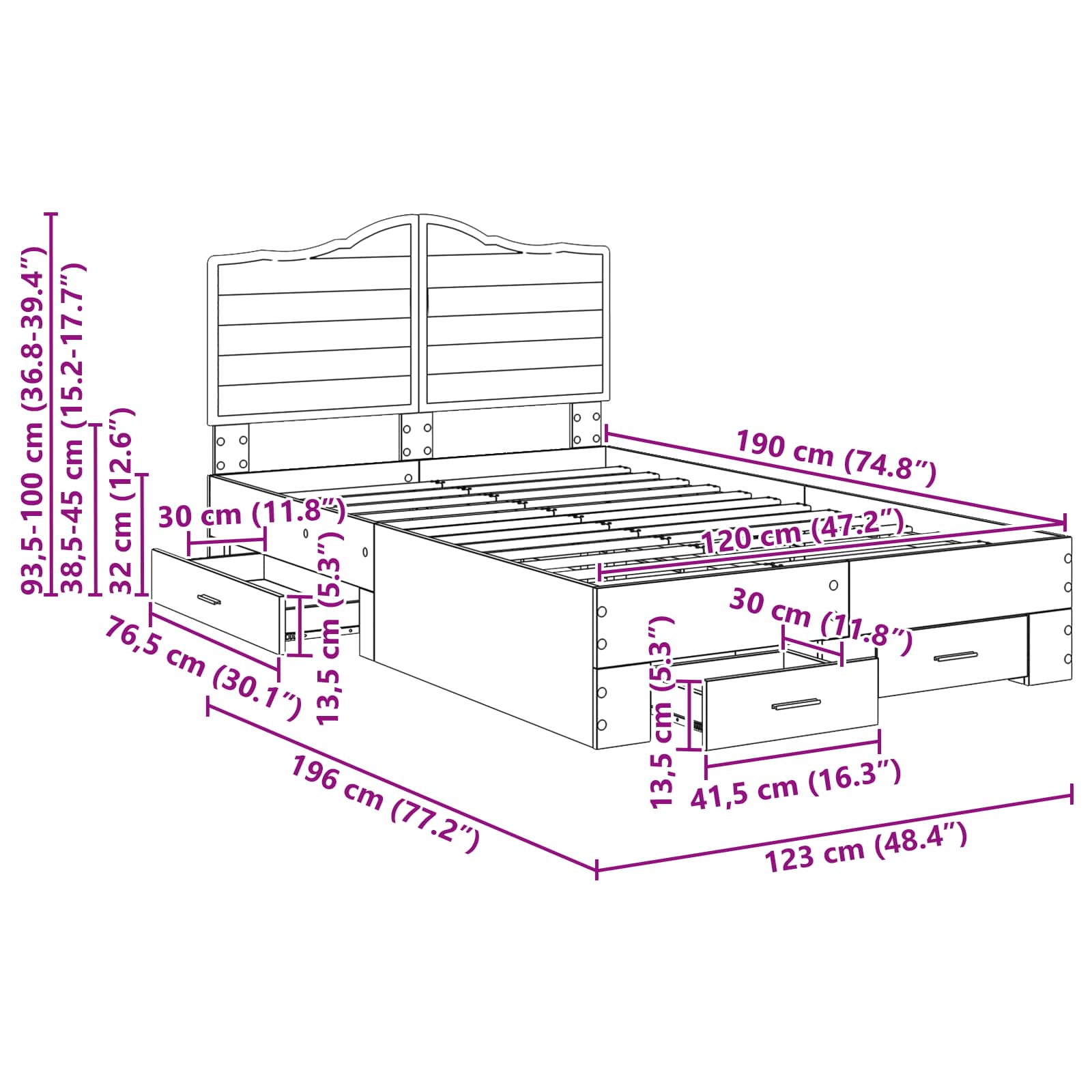 - Sisse ehitatud ladustamisvõimalused Voodi on varustatud avarate ja kergesti ligipääsetavate sahtlitega, et maksimeerida magamistoa ruumi. Need sahtlid võimaldavad tõhusalt hoida voodilinad, riided ja muud vajalikud asjad, vähendades segadust ja säilitades puhta ja mugava keskkonna. Kõik sinu asjad mahuvad kenasti ära, muutes ruumi funktsionaalsemaks.